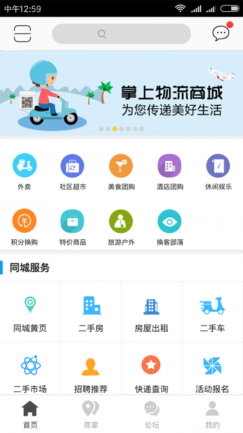 首頁:展示著所有的團購功能列表,廣告輪播圖,同城服務功能,黃頁信息,搜索框查找等。